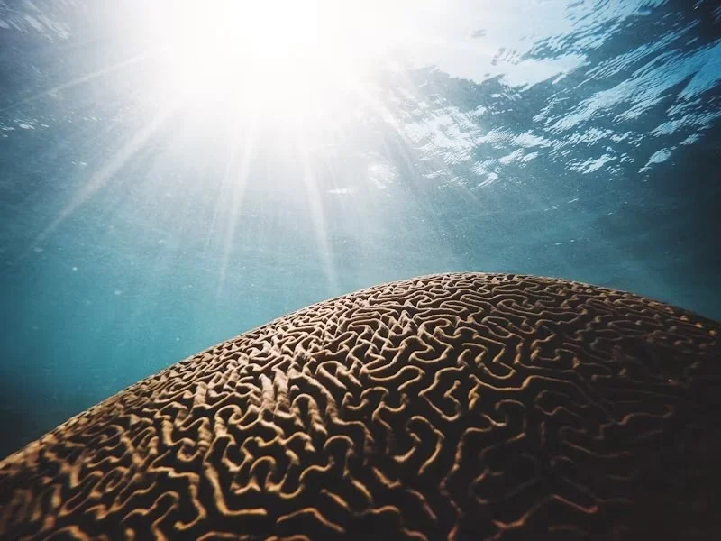 Underwater view of a brain-shaped coral against sunlight filtering through the water surface.